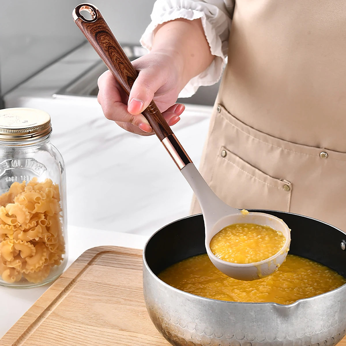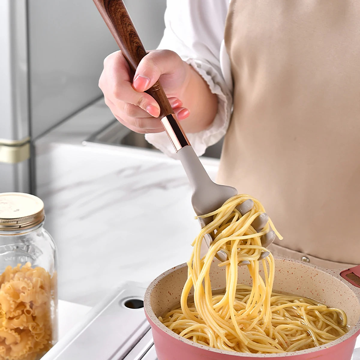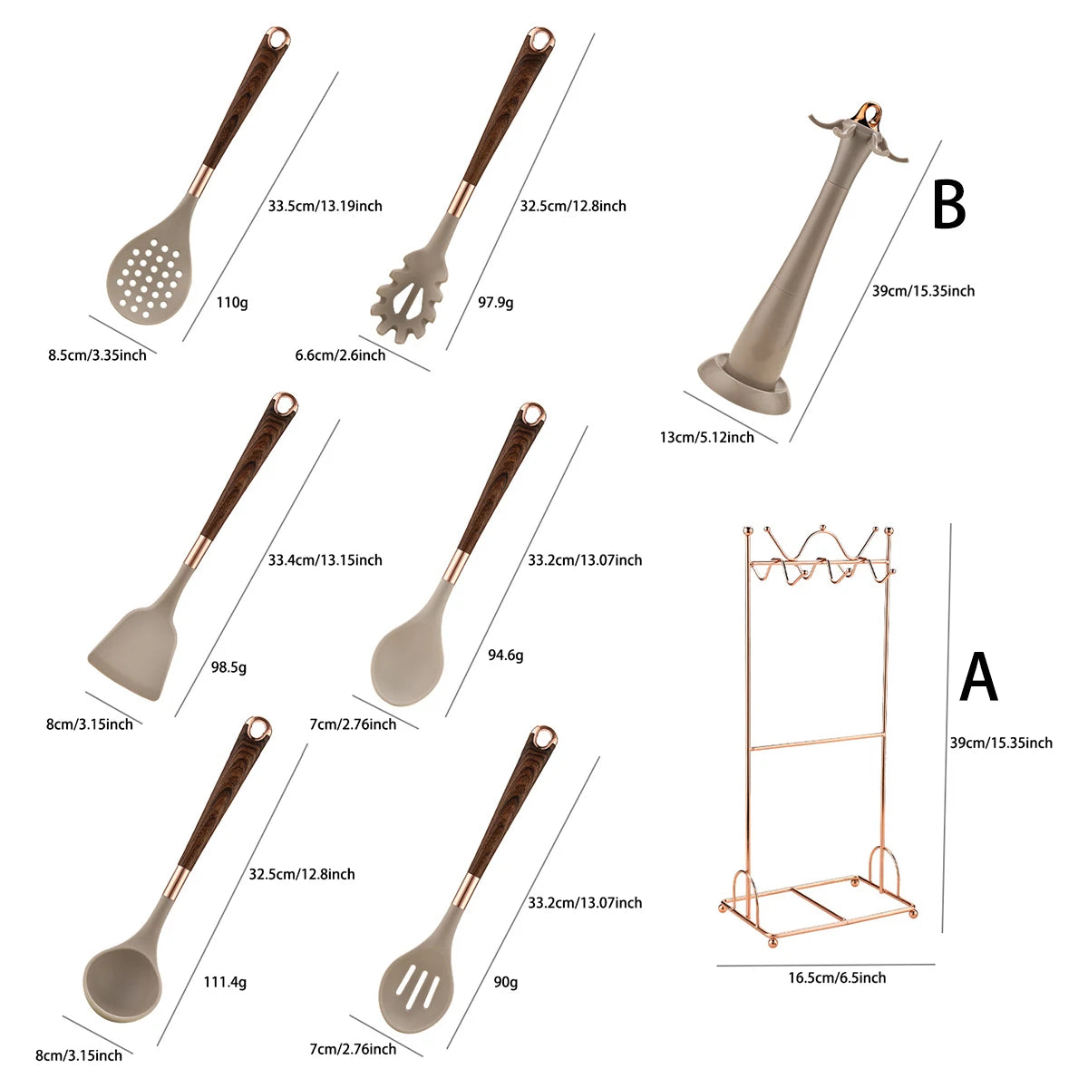The set includes a pot shovel, soup spoon, spaghetti claw, spatula, and more, all stored neatly in a matching storage rack to keep your kitchen organized and stylish. Perfect for home cooks, new homeowners, or anyone who wants durable, easy-to-clean utensils.