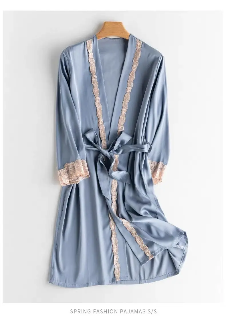 Women’s Satin Pajama Set – Lace Trim Sleepwear with Robe and Pants