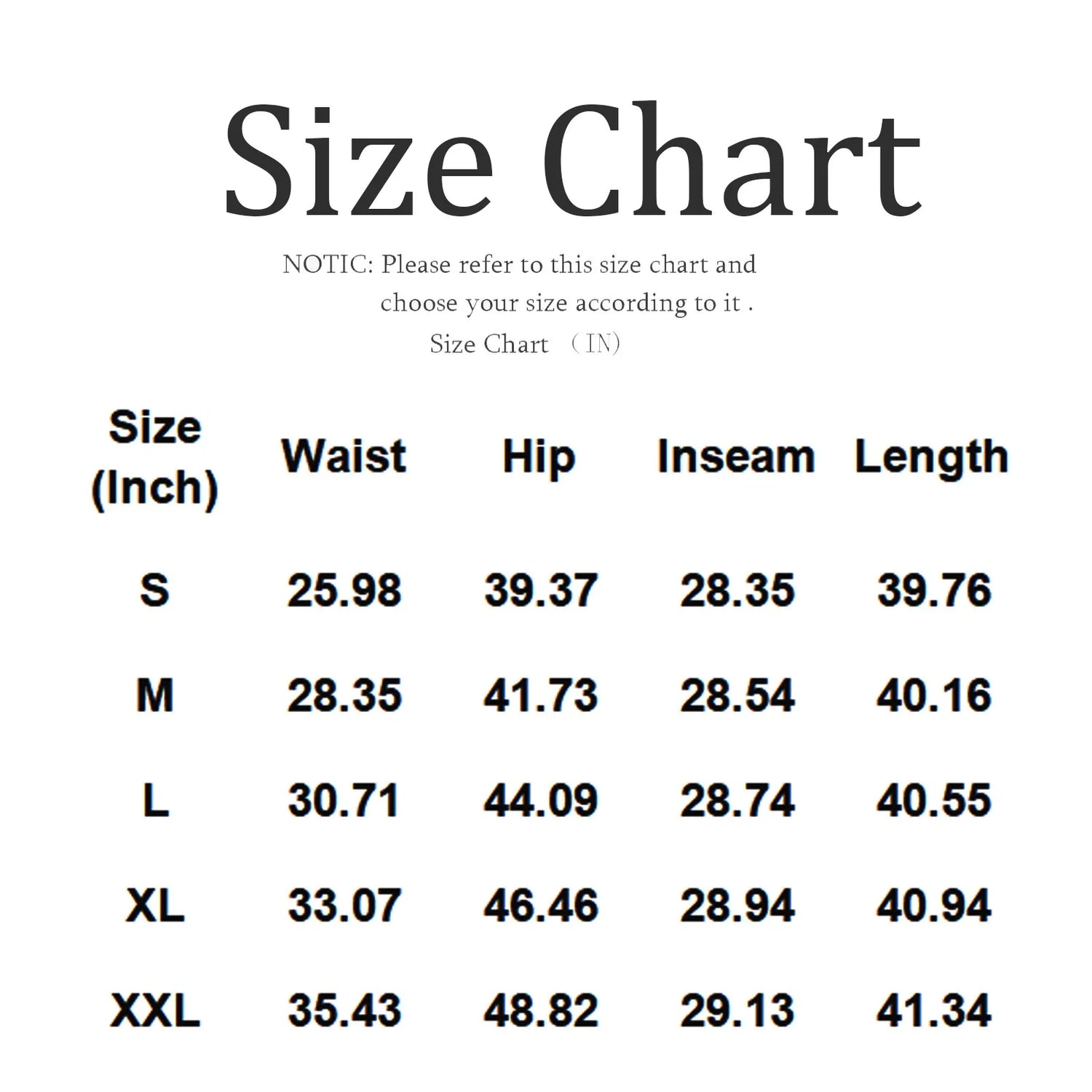 | Size | Waist | Hip | Inseam | Length |