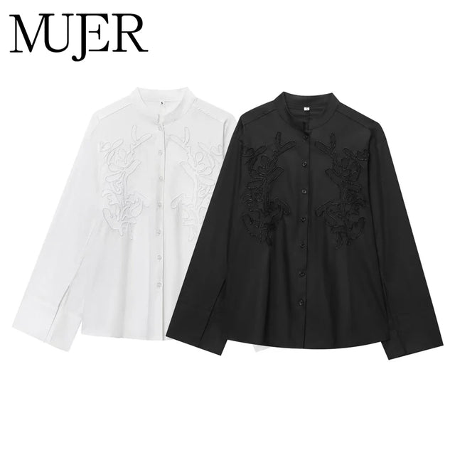 MUJER Women’s White Embroidered Button-Up Long Sleeve Summer Shirt